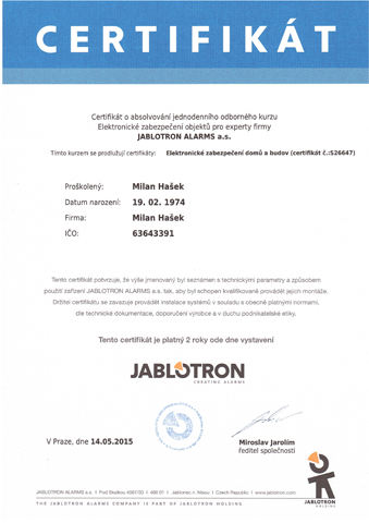 Dnes jsem s úspěchen absolvoval školení pro experty v elektronických zabezpečovacích zařízení (EZS) ve firmě Jablotron. Probrali jsme jsme nastavení a programování ústředen pro střední a velké instalace. Detailnější provedení specifických požadavků zákazníků. Například spojení ústředen řady 100 s nadřazeným systémem (foxtrot, loxone), který může plně ovládat a zobrazovat informace z ústředny. Certifikáty